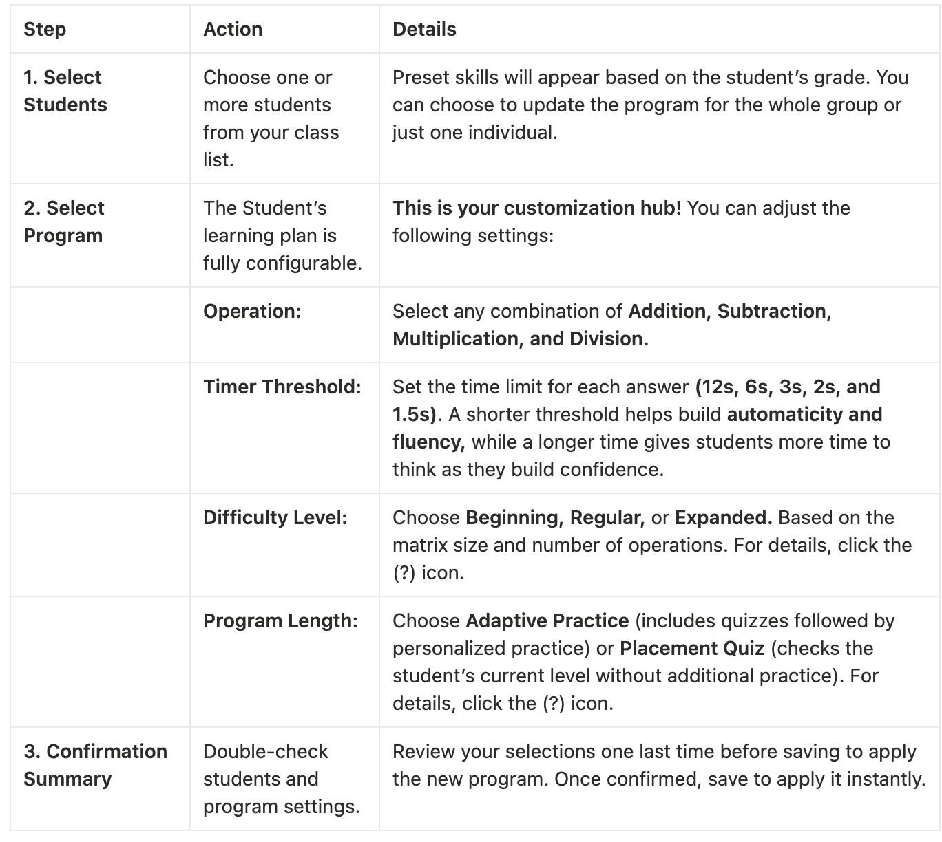 We’ve totally redesigned the Program Settings to be a true time-saver! You can customize and assign learning paths faster than ever before. You can now fully customize a student’s program using the streamlined Program Settings panel on the left side of your teacher dashboard.