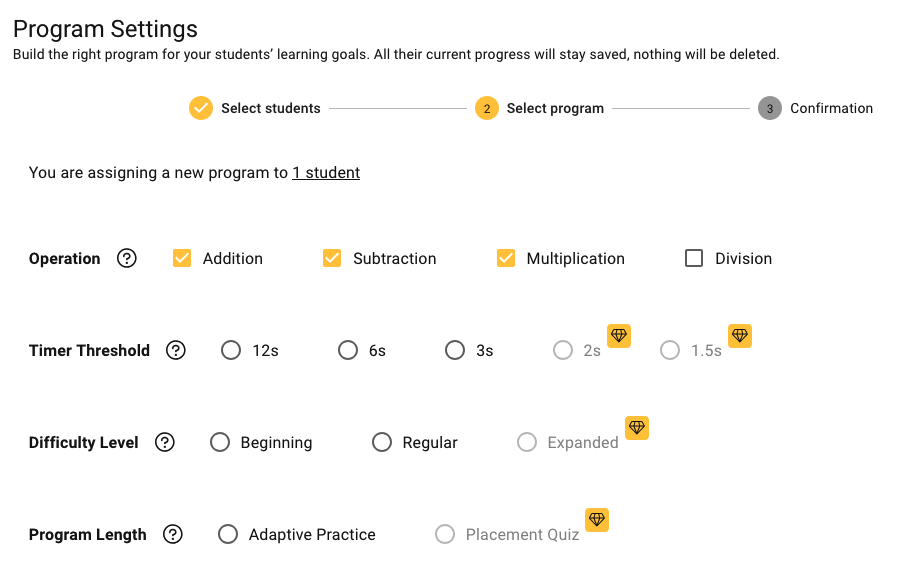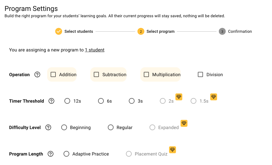 - For example: if you choose Multiplication, Addition + Subtraction will be preselected automatically, meaning the program will be composed of these 3 operations, and you won’t be able to choose only one operation — except in the case of Addition, which does allow single-operation selection.